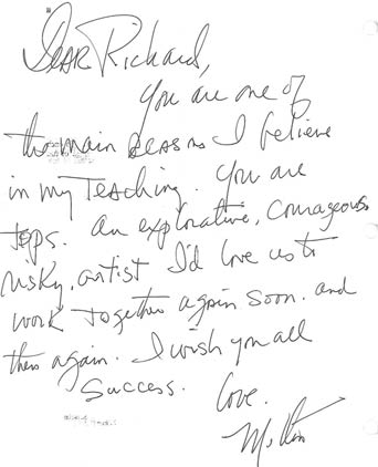 As you are aware, Richard has been an actor-teacher in the Milton Katselas workshops. He is an accomplished practitioner of Katselas' teachings and has years of successful communication of this method to students. From excellent actor he has grown into an excellent teacher. I have attended his classes and have been impressed with his ability to analyze the work of students and to help them enormously with constructive criticism. I have submitted scenes I have directed to Richard and benefited from his critiques.